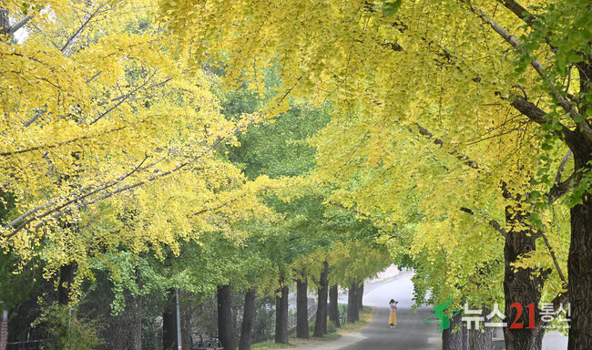 [뉴스21 통신=김희백 사회2부기자] 6일 경남 거창군 거창읍 의동마을 길 옆 은행나무가 연노란빛으로 물들어 가고 있다.