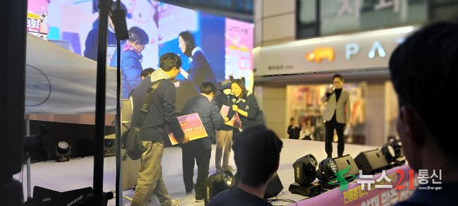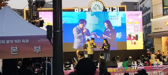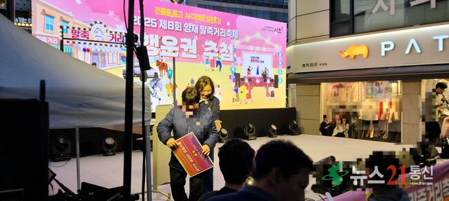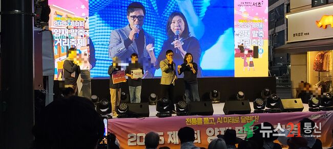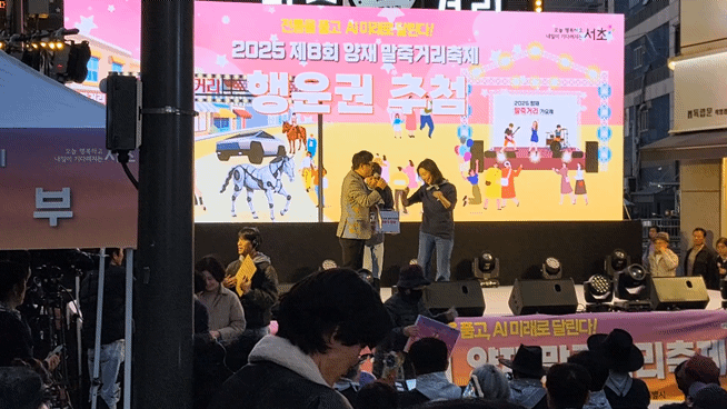 2025 제8회 양재 말주커리 축제에서 최호정 서울시의회 의장이 행운권 추첨을 하고 있다(사진=추현욱 기자)