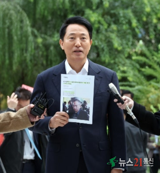 김건희 특검팀(특별검사 민중기)은 이날 오전 9시부터 정치자금법 위반 혐의를 받는 오 시장을 조사한다. 오 시장은 오전 8시 59분 취재진 앞에서 “이 자료를 봐달라. 명태균이 우리 캠프에 제공했다는 비공표 여론조사 대부분이 조작됐다는 경향신문 기사”라며 “이것조차도 저희 캠프에 정기적으로 제공된 사실이 없다는 것이 포렌식 결과 밝혀졌다”고 말했다. 그러면서 “이런 점을 비롯해 여러 가지 사실을 밝혀 공정한 조사를 받도록 하겠다”고 했다.