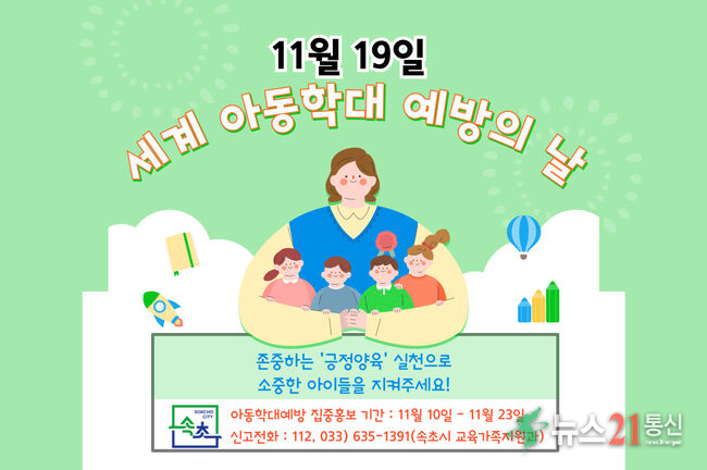 속초시는 11월 19일 ‘세계 아동학대 예방의 날’을 맞아 아동권리 존중 인식을 확산하고 지역사회 내 아동학대 예방 분위기를 조성하기 위해 11월 10일부터 23일까지 아동학대 예방 집중홍보 기간을 운영한다.