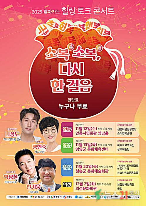 경상북도와 경북문화재단은 상반기 대형 산불로 큰 피해를 본 안동, 영양, 청송, 의성 지역민을 위로하기 위한 치유형 문화예술행사 ‘찾아가는 힐링 토크 콘서트-소복소복, 다시 한 걸음’을 개최한다.