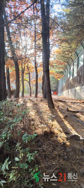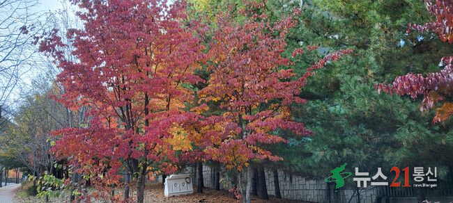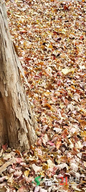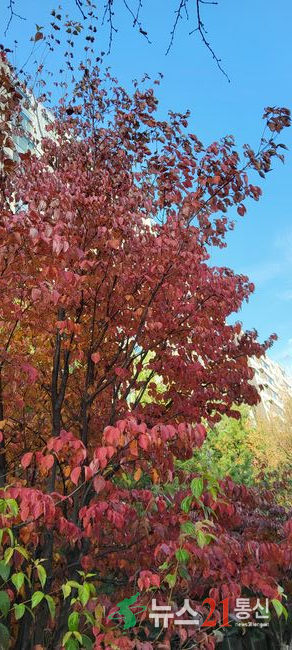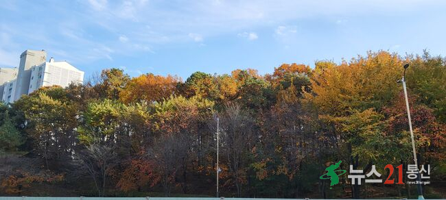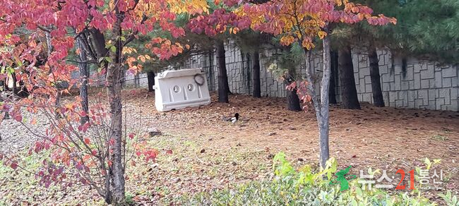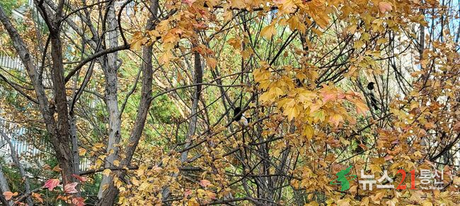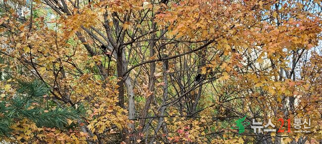 노랗게 물든 나뭇잎 사이로 보이는 까치들.(사진=추현욱 기자)