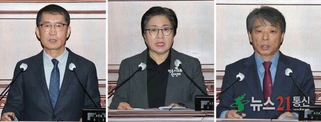 11일열린 제308회 정읍시의회 제2차 정례회 제1차 본회의,외쪽부터 이복형 의원,한선미 의원,이도형 의원이'5분 자유발언'을 하고있다.