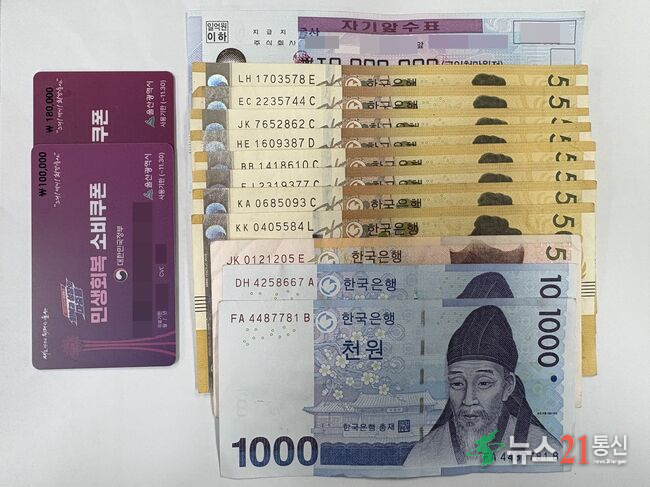 그는 "올해는 벌이가 예년같지 않아 이 정도 뿐"이라며 주머니에서 가지런히 정리된 돈 뭉치와 카드를 꺼냈다. "사용하지 않은 민생회복 소비쿠폰"이라며 내놓은 18만원권과 10만원권 카드 각 1장과 10,000,000원권 수표 1장, 5만원권 8장, 5천원권 1장, 1천원권 2장 등 현금이었다.