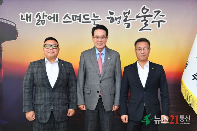 이순걸 울주군수가 10일 군청 소회의실에서 신임 인사차 내방한 김한준 민주평통 울주군협의회장(오른쪽) 일행의 내방을 받고 환담을 나눈 뒤 기념촬영을 하고 있다.