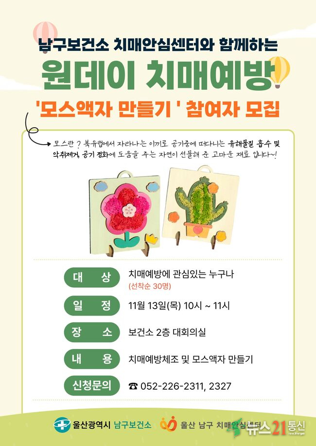 치매예방 프로그램 참여를 희망하는 주민과 기관은 남구보건소 치매안심센터(☎052-226-2323)로 문의하면 된다.