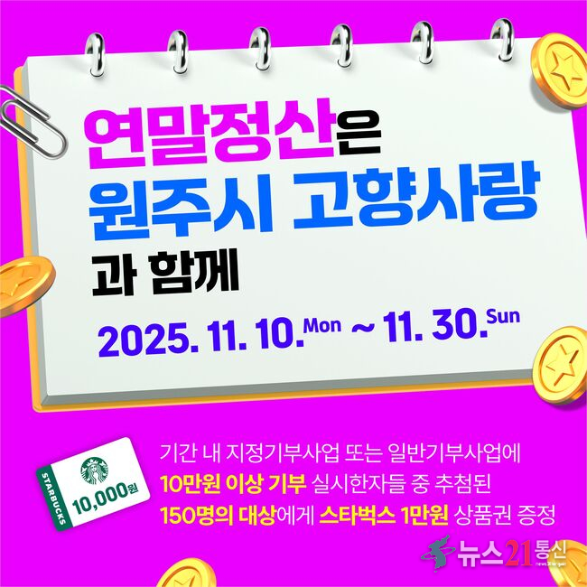원주시는 지정기부사업인 ‘청소년밴드 동아리 활성화 지원사업’을 시민들에게 널리 알리고, 고향사랑기부제 참여를 독려하기 위해 스타벅스 상품권 추첨 이벤트를 실시한다.