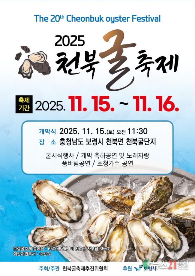 보령시는 천북굴단지 상인회(회장 황용현)가 주최·주관하는 ‘2025 천북 굴축제’가 오는 11월 15일부터 16일까지 2일간 천수만 농어촌테마공원(천북 굴단지) 일원에서 개최된다고 밝혔다.