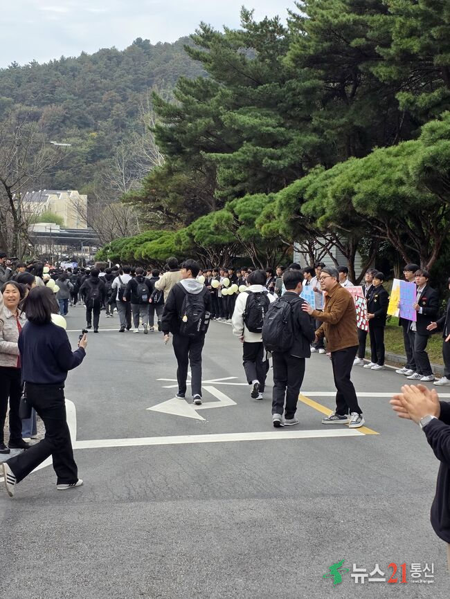 1·2학년 학생들과 교직원 등 400여 명은 교내 대동인의 상~학교 진입로 삼거리에서 하교하는 3학년 학생들을 맞아 박수갈채를 보내고 “수능 대박! 파이팅!”을 외치며 열렬한 응원을 보냈다.