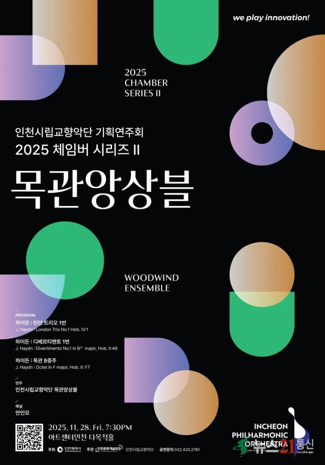 인천시립교향악단이 다가오는 11월 28일 금요일 오후 7시 30분, 아트센터인천 다목적홀에서 기획연주회 <2025 체임버 시리즈 Ⅱ – 목관앙상블>을 개최한다.