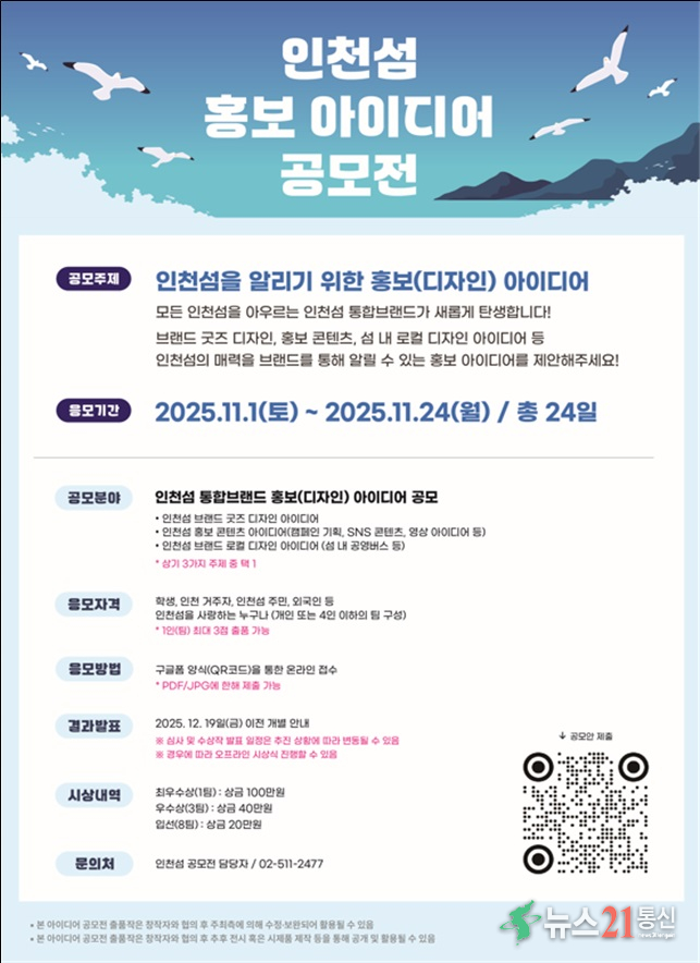 인천광역시(시장 유정복)는 인천의 섬들이 지닌 고유한 매력과 이야기를 시민들의 창의적인 시각으로 새롭게 담아내기 위해 ‘인천섬 홍보 아이디어 공모전’을 개최한다고 밝혔다.