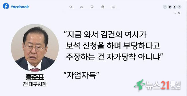 홍준표 전 대구시장이 김건희 여사 측의 보석 신청 발언을 두고 “자업자득”이라고 비판했다.