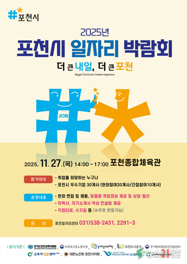 포천시(시장 백영현)는 오는 27일 포천종합체육관에서 지역의 구인난 해소와 구직자의 취업 기회 확대를 위한 ‘2025년 포천시 일자리 박람회’를 개최한다.
