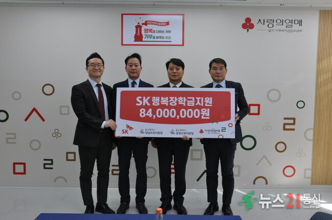 [뉴스21 통신=최세영 ]▲ 사진제공=울산광역시교육청울산 강북교육지원청(교육장 한성기)과 강남교육지원청(교육장 임채덕)은 9일 울산사회복지공동모금회(회장 전영도)에서 SK행복장학금 8,400만 원을 전달받았다. SK행복장학금 지원사업 전달식은 이날 오전 11시 남구 울산 사랑의 열매 회의실에서 열렸으며, 한성기 강북교육장과 임채...