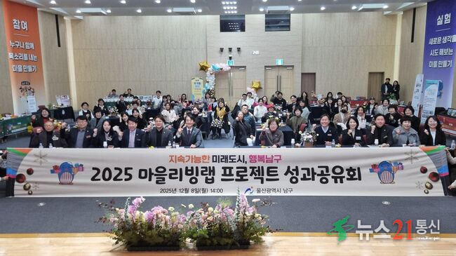 [뉴스21 통신=최세영 ]▲ 사진제공= 울산광역시남구청울산 남구(구청장 서동욱)는 8일 남구청 6층 대강당에서 ‘2025년 마을리빙랩 프로젝트’ 성과공유회를 열고 활동한 13개 프로젝트 팀을 격려하며 활동을 공유하는 시간을 가졌다. 이번 성과공유회에서는 다양한 분야에서 마을 문제 발굴과 해결을 위한 활동을 펼친 프로젝트 팀...