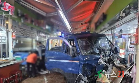 오늘 오전 11시쯤 경기 부천시 오정구 원종동에 있는 제일시장 근처에서 달리던 1톤 화물차가 상가로 돌진해 21명이 다쳤다.