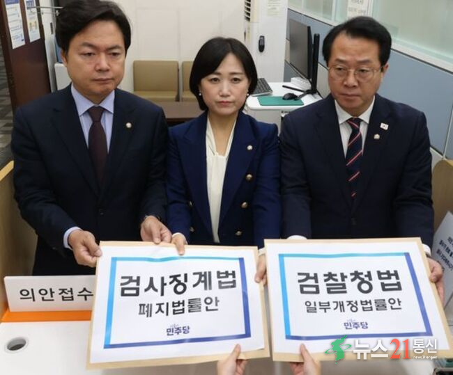 더불어민주당 문금주·김현정·백승아 원내대변인이 14일 국회 의안과에서 검찰청법·검사징계법개정안을 제출하고 있다. (사진 =네이버db )