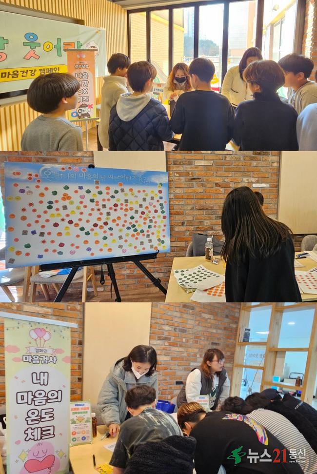 이번 캠페인은 본교 학생 전원을 대상으로 진행되었으며 ▲마음건강 OX 퀴즈 ▲오늘의 마음 날씨 체크 ▲내 마음의 온도 확인 ▲인생네컷 촬영 등 참여형 체험 부스로 구성되었다. 학생들은 다양한 활동을 통해 자신의 감정을 탐색하고 표현하며, 마음건강의 중요성을 자연스럽게 경험하는 시간을 가졌다.