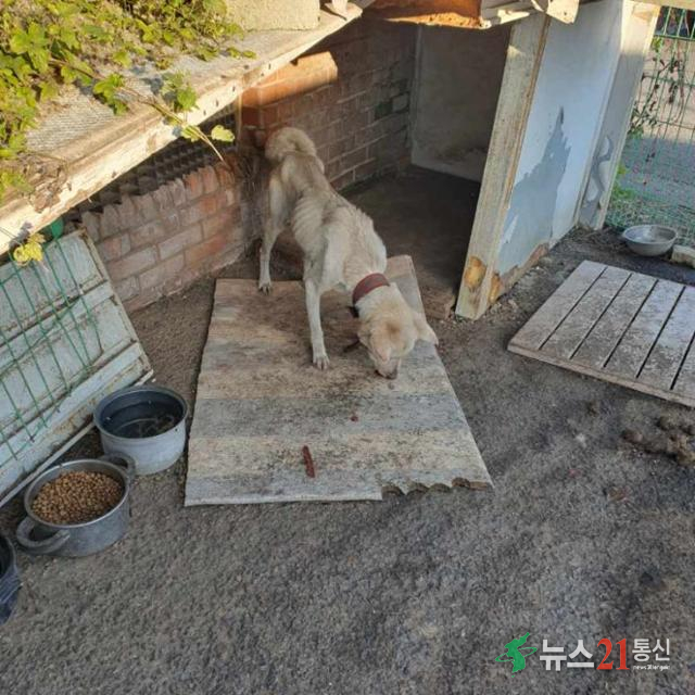 사료가 충분히 있음에도 건강이 악화된 개를 목격자가 동물자유연대에 구조 요청을 하였다.