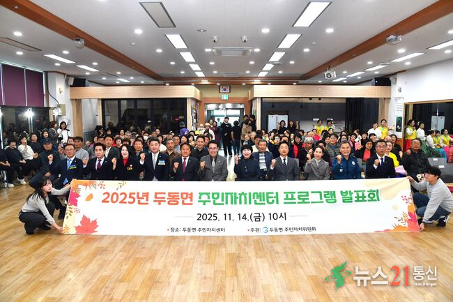 울주군 두동면 주민자치위원회가 14일 두동면 주민자치센터에서 ‘2025년 두동면 주민자치 프로그램 발표회’를 개최한 가운데 이순걸 군수와 울주군의회 정우식 부의장 및 군의원 등 참석자들이 기념촬영을 하고 있다.