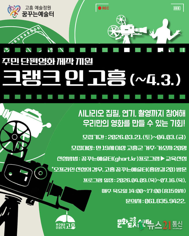 고흥군(군수 공영민)이 주민이 직접 시나리오 작성부터 연출, 연기, 촬영까지 전 과정에 참여해 한 편의 영화를 완성하는 주민 단편영화 제작 지원 프로그램 ‘크랭크 인 고흥’ 2기 참여자를 모집한다.고흥군문화도시센터가 주관하는 이번 2기 과정은 지난해 1기에서 수강생 18명이 제작한 수준 높은 단편영화 2편을 바탕으로 한층 더 .