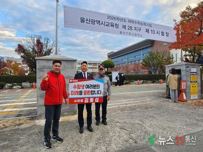 2025년 11월 13일(목), 수능시험 날 아침 울산가온고등학교 정문 앞은 긴장과 설렘, 그리고 따뜻한 응원의 분위기로 가득했다. 이른 시간부터 지역구 김종섭 시의원과 나토얀태권도 최병호, 반구1동 반구지구대 소장님이 학교 정문에서 수험생들을 환영하며 힘찬 응원을 보냈다. “수험생들 화이팅! 반드시 좋은 결과 있을 겁니다!”라는 응원의 말들이 이어지며 학생들은 떨리는 마음 속에서도 용기와 위로를 얻었다.