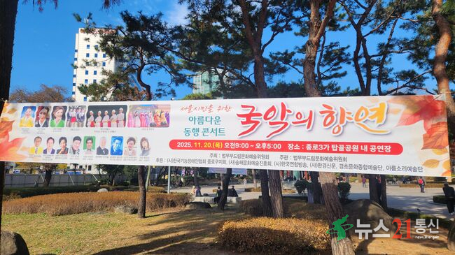 오는 2025년 11월 20일, 서울 종로3가 탑골공원 내 공연장에서 서울 시민을 위한 대규모 국악 문화축제 **'아름다운 동행 콘서트 - 국악의 향연'**이 열린다.