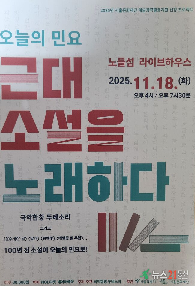 1920~1930년대를 풍미했던 한국 근대문학의 대표 단편소설들이 국악의 새 숨결을 입고 현대 무대에 오른다. 국악합창단 두레소리는 오는 11월 18일(화) 서울 노들섬 라이브하우스에서 창작 국악 프로젝트 **「오늘의 민요 - 근대 소설을 노래하다」**를 선보인다. 이번 공연은 서울문화재단 예술창작활동지원에 선정된 작품으로, 세대를 아우르는 새로운 민요의 감성을 관객에게 전달할 예정이다.