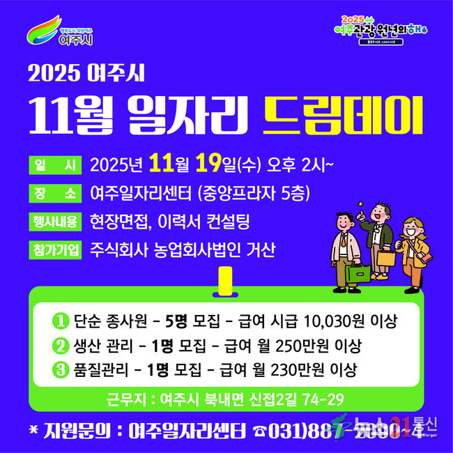 여주시(시장 이충우)는 오는 11월 19일 오후 2시 여주일자리센터(세종로 14번길 18, 중앙프라자 5층)에서 ‘2025년 11월 일자리드림데이’를 연다. 매달 열리는 일자리드림데이는 단순한 채용 행사를 넘어 지역 안에서 일자리가 꾸준히 이어지는 구조를 만들기 위한 여주일자리센터의 대표 취업 지원 프로그램이다. 이번 행사는 북내면에 ..