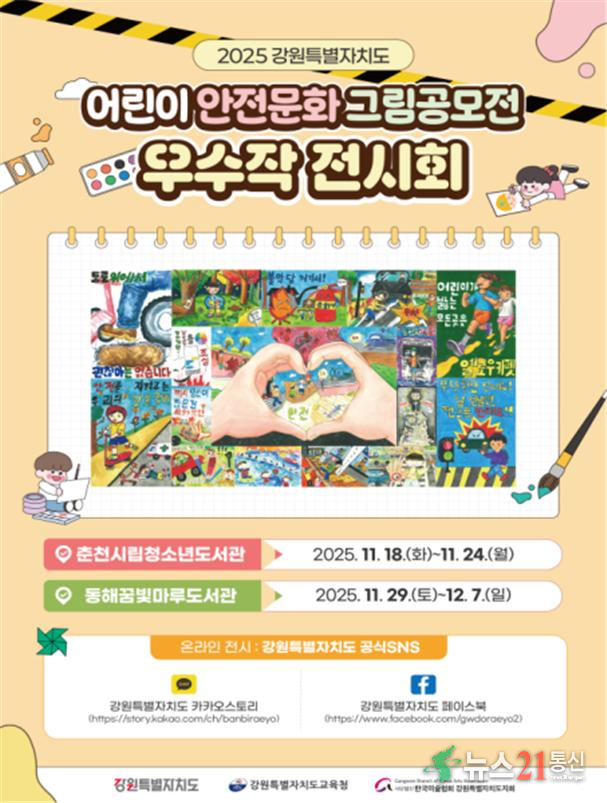 □ 강원특별자치도(도지사 김진태)는 11월 18일부터 12월 7일까지 춘천시립청소년도서관과 동해꿈빛마루도서관에서 「어린이 안전문화 그림 공모전 우수작 전시회」를 개최한다고 밝혔다.