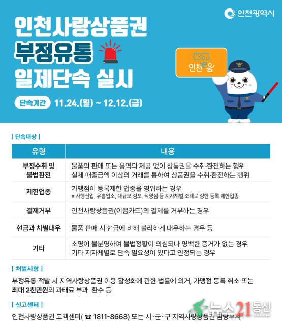 인천광역시(시장 유정복)는 11월 24일부터 12월 12일까지 인천사랑상품권의 부정 유통을 방지하고 건전한 유통 질서를 확립하기 위해 일제 단속을 실시한다고 밝혔다.