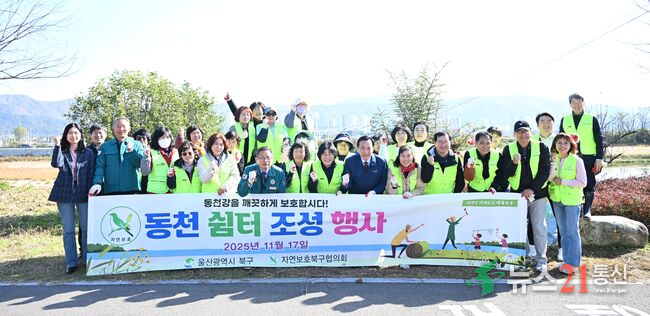 자연보호북구협의회는 17일 동천 시례잠수교 인근 주민쉼터에서 환경정비활동을 실시했다. 박천동 북구청장이 회원들을 격려한 후 기념촬영을 하고 있다.