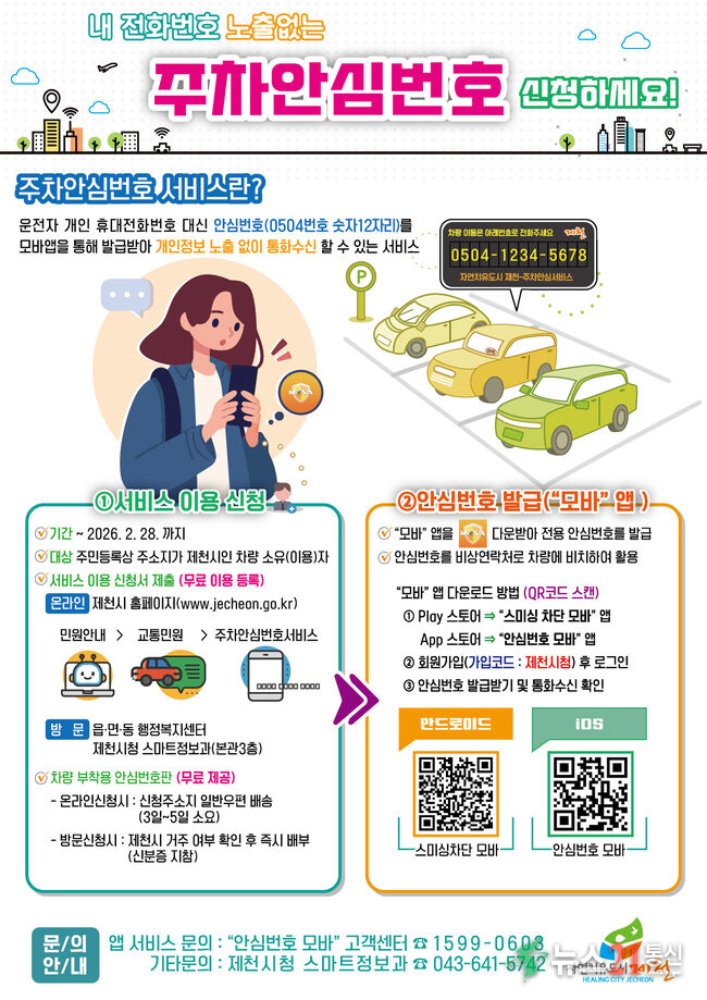 제천시 ‘주차안심번호 서비스’ 포스터.충북 제천시가 도입한 ‘주차 안심번호 서비스’가 이용자 3천 명을 돌파하며 시민 생활 안전을 위한 대표 보안 서비스로 자리 잡고 있다.