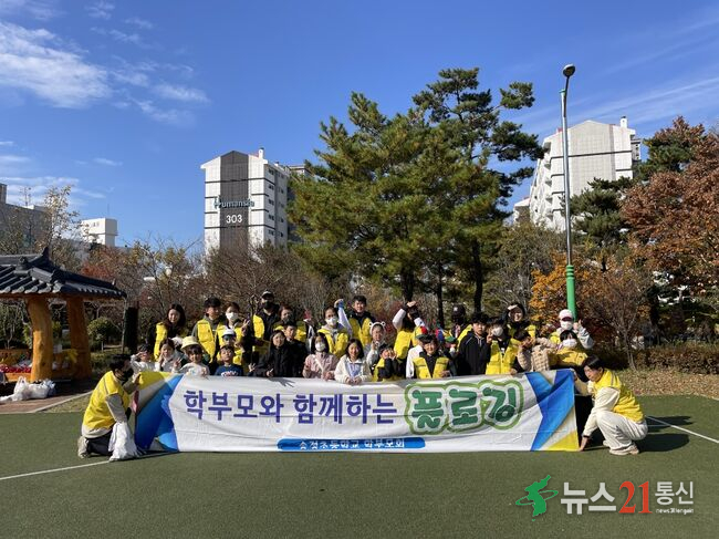 울산 북구 송정초등학교(교장 김태견) 학부모회와 학생들이 지난 16일 학교 인근 한솔 근린공원에서 쓰담 달리기(플로깅) 행사를 열었다.
