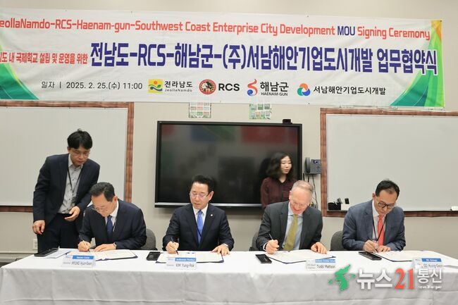 [뉴스21 통신=박철희 ] 재단법인 해남군교육재단(이사장 명현관)은 지난 17일 전남도청 서재필실에서 열린 ‘전남도 외국교육기관 설립 연구용역 착수보고회’에 참석해 솔라시도 기업도시 내 국제학교 유치를 위한 논의를 본격화했다.이번 보고회는 해남 구성지구 솔라시도 기업도시와 순천 신대지구 광양만경제자유구역에 외국교육...