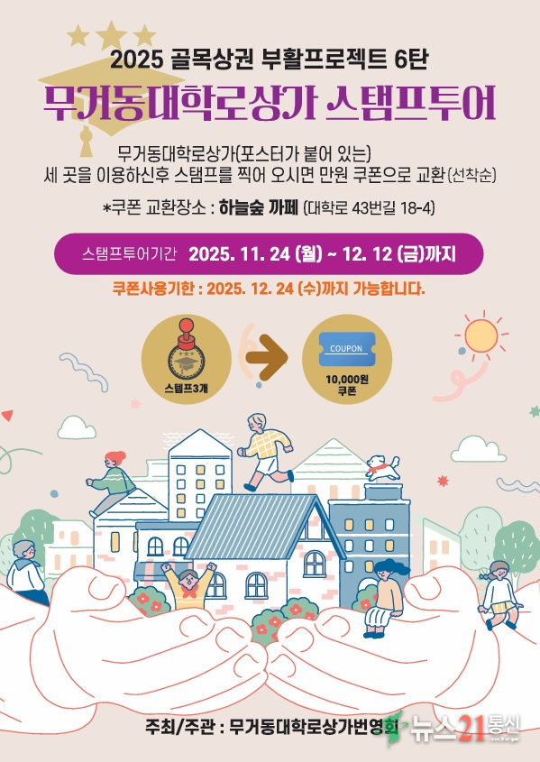 울산 남구(구청장 서동욱)는 울산과학대학교 옆 골목상권 일원에서 무거동대학로상가번영회(회장 황진구) 주관으로 11월 24일부터 12월 12일까지 3주간 ‘무거동대학로상가 스탬프 투어’소비촉진 행사를 진행한다고 밝혔다.