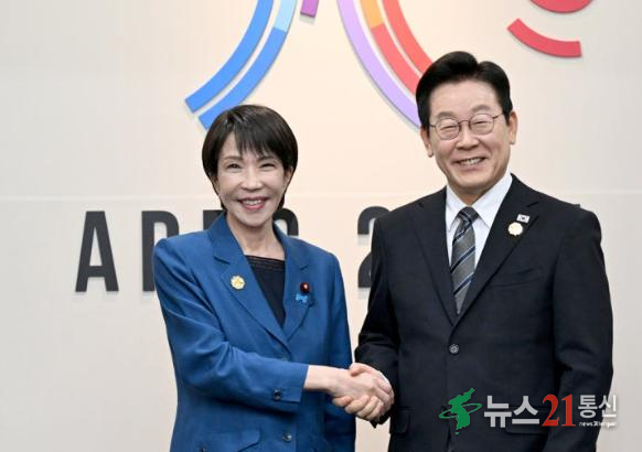 이재명 대통령이 30일 경북 경주 APEC 정상회의장에서 다카이치 사나에 일본 총리와 한-일본 양자회담에 앞서 악수를 나누고 있다.