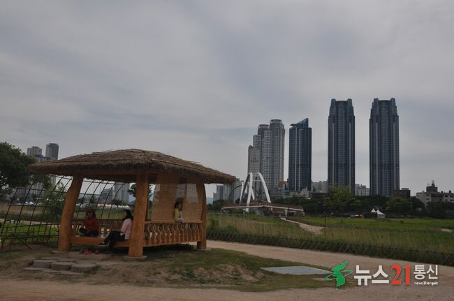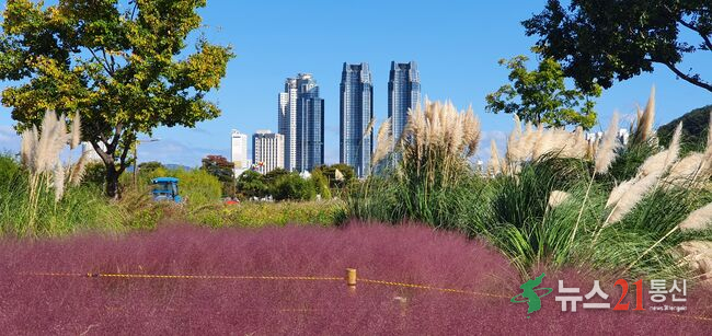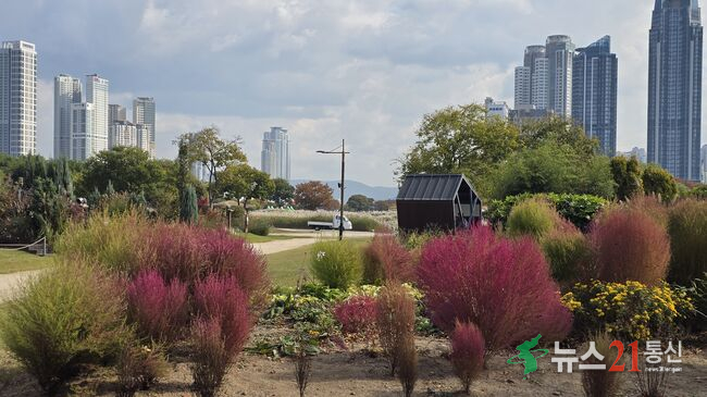 노을이 내려앉는 시간, 정원은 황금빛 억새와 잔잔한 강물, 붉은 하늘이 어우러져 한 폭의 수채화를 연출한다. 산책을 즐기던 시민들은 발걸음을 멈추고 카메라 초점을 맞추며 초겨울의 정취를 기록했다.