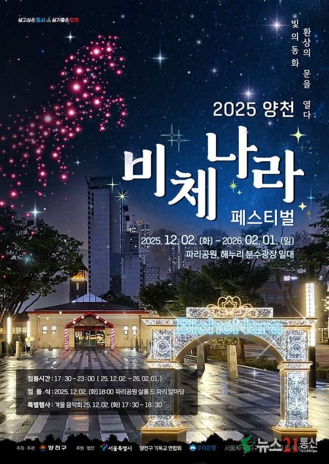 양천구(구청장 이기재)는 연말연시를 맞아 구민에게 따뜻한 감성과 환상적인 볼거리를 선사하기 위해 11월 28일부터 2026년 2월 1일까지 파리공원과 해누리분수광장에서 ‘2025 양천 비체나라 페스티벌’을 개최한다고 밝혔다.