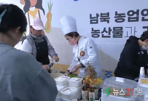 대형마트 한 켠이 신나는 노랫가락과 사람들로 북적였다. 햅쌀, 갓 담근 김치, 햇고구마부터 북한식 만두까지 다양한 농산물이 매대를 가득 채웠다.