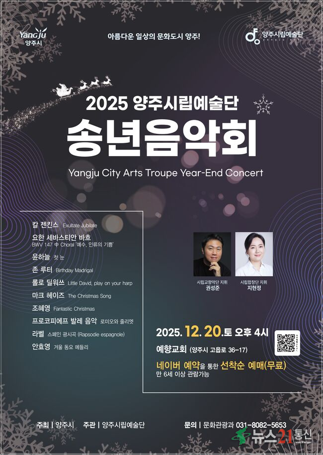 양주시가 오는 12월 20일 오후 4시, 예향교회(고읍로 36-17)에서 ‘2025 양주시립예술단 송년음악회’를 개최한다.