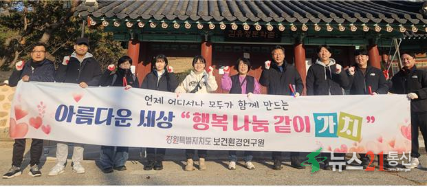 □ 강원특별자치도보건환경연구원은 11월 22일 김유정문학촌 및 금병산 일대에서 건강과 환경을 지키는 ‘플로깅(plogging)’ 봉사활동을 실시했다. ‘플로깅(plogging)’은 조깅을 하며 쓰레기를 줍는 활동의 합성어로, 건강 증진과 환경보호를 동시에 실천할 수 있는 친환경 운동이다.