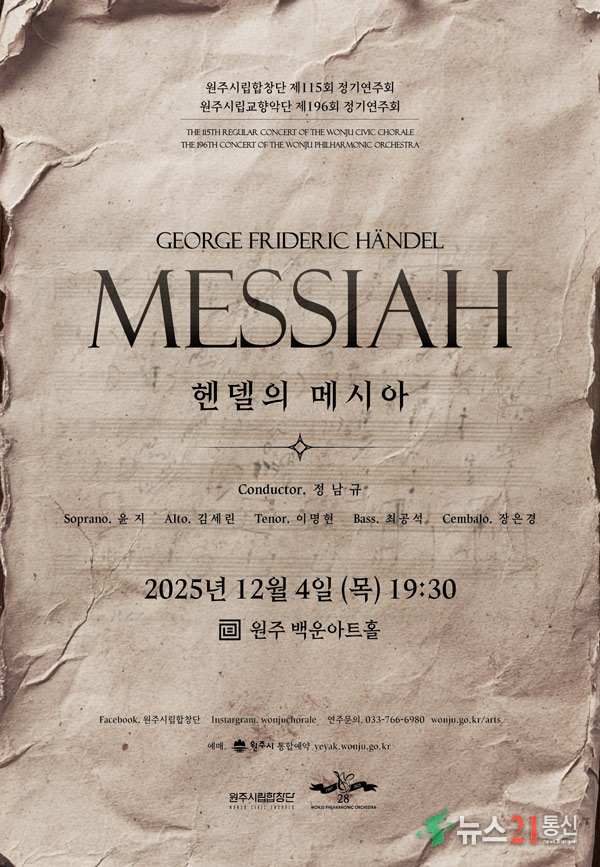 원주 시립합창단과 시립교향악단은 오는 12월 4일 오후 7시 30분 백운아트홀에서 정기연주회 ‘헨델의 메시아’를 개최한다.