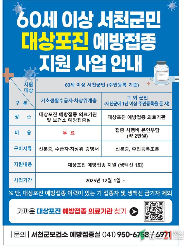 서천군은 고령층의 대상포진 발병과 합병증을 예방하고 건강한 노후를 지원하기 위해 오는 12월 1일부터 대상포진 예방접종 지원사업을 본격 추진한다.
