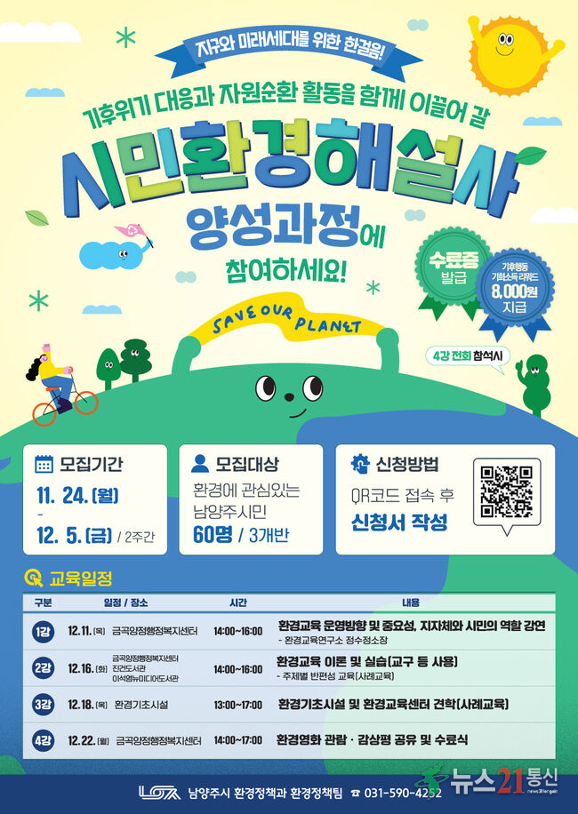 교육은 12월 11일부터 12월 22일까지 총 4회 진행되며, 20명씩 3개 반으로 구성돼 총 60명을 선착순으로 모집한다. 참여를 희망하는 시민은 안내된 QR코드로 접속해 신청서를 작성하면 된다.