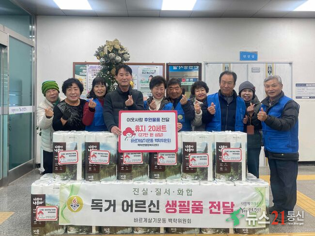 연천 바르게살기운동 백학면 위원회(위원장 정영희) 회원들이 지난 25일 백학면사무소를 찾아 이웃돕기 생필품(휴지) 20세트를 기탁했다.