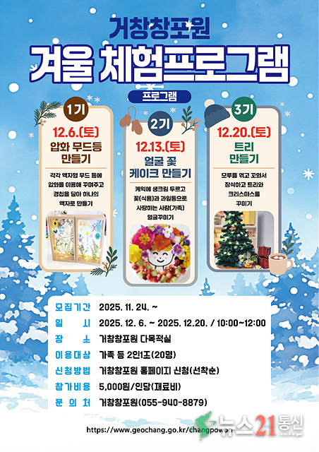 [뉴스21 통신=김희백 사회2부기자] 거창군 창포원은 사계절 체험프로그램과 정원 프로그램 활성화를 위해 다음 달 6일부터 방문자센터 다목적실과 열대식물원에서 다양한 겨울 체험 프로그램을 운영한다고 25일 밝혔다.
