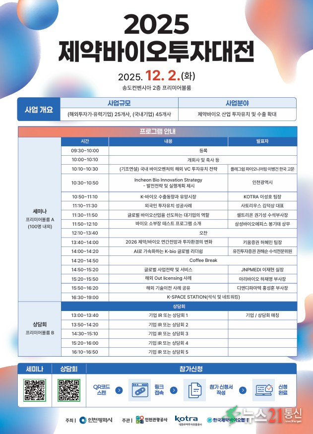 인천광역시(시장 유정복)가 주최하고 인천관광공사와 KOTRA, 한국제약바이오협회가 공동 주관하는 ‘제약바이오투자대전’이 오는 12월 2일 인천 송도컨벤시아 프리미어볼룸에서 열린다.