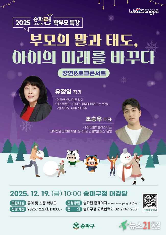 특강은 유아, 초등·중학생 자녀 학부모를 대상으로 무료로 진행되며 참여 신청은 내달 2일 10시 송파런 누리집에서 사전 접수하면 된다.
