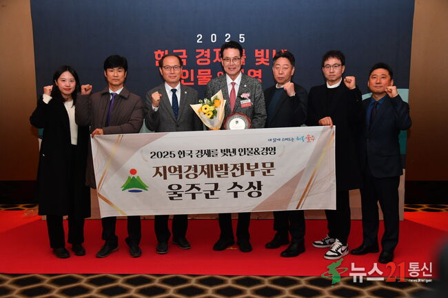 울산 울주군이 ‘2025 한국 경제를 빛낸 인물&경영’ 지역경제발전 부문에서 수상한 가운데 27일 서울 더플라자호텔에서 열린 시상식에서 이순걸 군수와 관계 공무원들이 수상 기념촬영을 하고 있다.